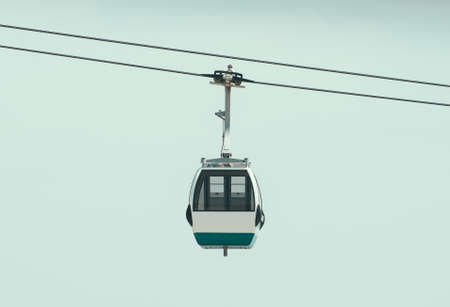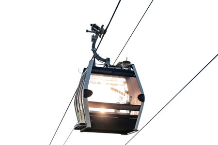 The cable car is suspended in the air. The cable car has a large window. Cable car cabin in the air isolated on white background.