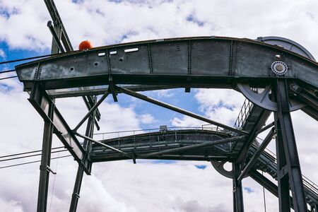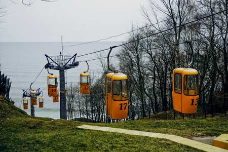 Cable car with orange elevators travels from the top of the mountain down to the seashore, a cloudy autumn day