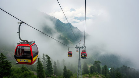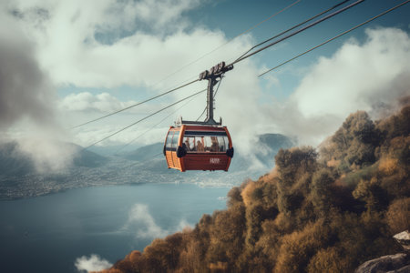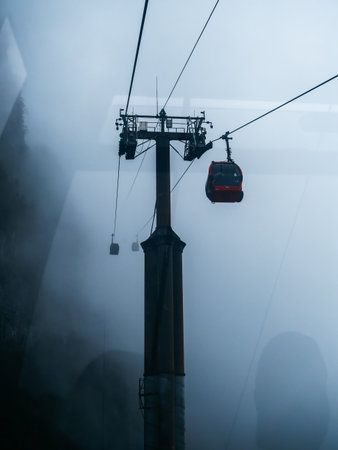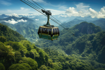 A cable car glides through the clouds above the mountain, offering stunning landscape views-an iconic mode of transport in travel and tourism adventures.