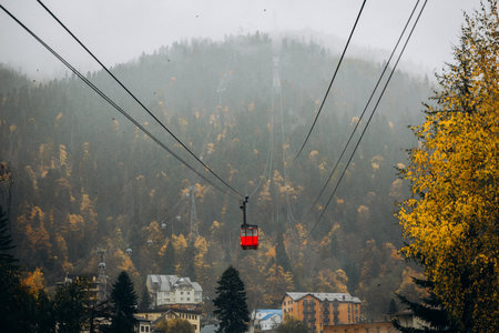 Red gondola cabin transports tourists over the mountain village of Dombay, surrounded by misty peaks and golden autumn forest in the Caucasus