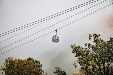 Gondola cabins move across the foggy Dombay sky during an early snow, showcasing the contrast between golden autumn foliage and harsh mountain weather
