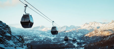 A sleek gondola lift moves smoothly through a breathtaking winter landscape, surrounded by majestic snowy peaks under a clear blue sky. Perfect for winter adventures.