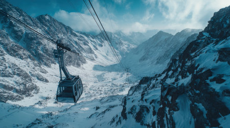 Discover a mesmerizing winter landscape featuring a cable car gliding above snow-covered mountains, capturing the beauty of nature and adventure.
