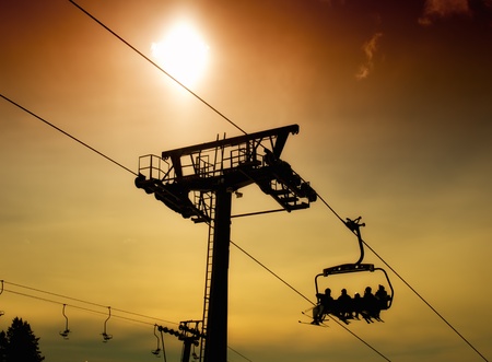 empty ski lift / chairlift silhouette on high mountain over the clouds at sunset