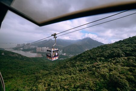 Cableway passing in front of Hong Kong residential buildings and jungle