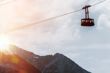 Chair ski lift for mountain skiers and snowboarders moves in the air on a rope on the background of winter snow capped mountains.