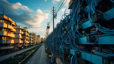 Telecommunication network cables and wires in network switchyard at sunset.