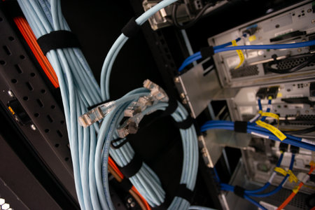 Close up view of internet equipment and cables in the server room.