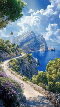 A picturesque road meanders along rocky cliffs, flanked by lush greenery and blooming flowers, leading to a lighthouse overlooking the calm Mediterranean waters.