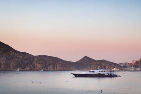 Private yatch in the harbor of Cabo San Lucas with paddleboarders.