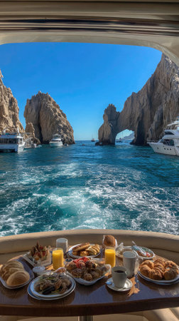 A breakfast buffet is arranged on a yacht table. The scene presents various food items with drinks. The bright sunlight and calm waters accentuate the view of the natural rock formations in the distance. This image could be suitable for promotional materials or editorial content.
