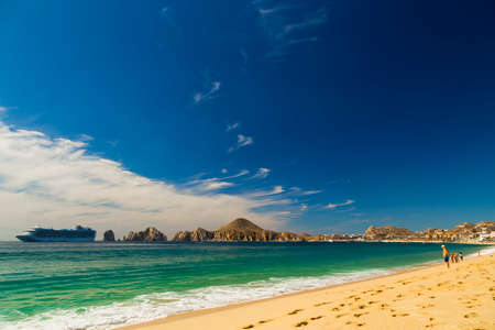 Cabo San Lucas, Mexico - January 10, 2023: Panoramic view of the black coral beach of Cabo San Lucas in the state of Baja California Sur of Mexico. Ideal place for beach and summer vacations.