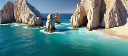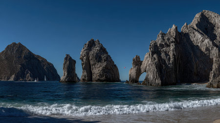 A stunning panoramic photograph of the famous sea stacks at Lands End in Cabo San Lucas, with blue ocean waves crashing on the shore under a clear sky.