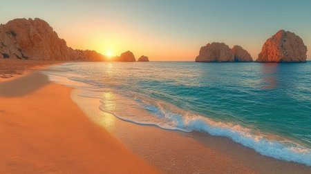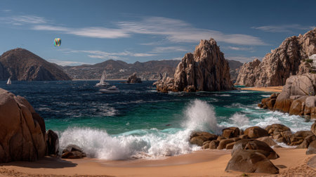 A stunning coastal landscape of Cabo San Lucas featuring powerful ocean waves on a golden beach in front of the iconic El Arco landmark under a sunny blue sky.