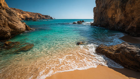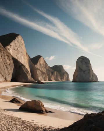 AI Generated. Stunning coastal view of secluded beach surrounded by cliffs in clear blue waters
