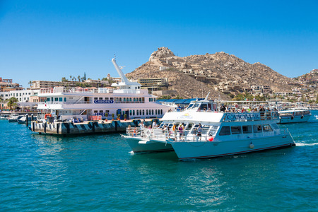 CABO SAN LUCAS, MEXICO -MARCH 20, 2012 : Travel catamarans in Cabo San Lucas marina, popular touristic destination on Baja California, Mexico. Holiday travel port in Mexico