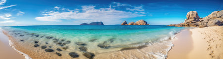 Panoramic view of a paradise beach with white sand, palm trees and crystal clear water. Generative AI