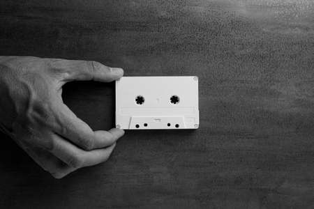 A man's hand grabs a white magnetic audio tape on a wooden base. Audio cassette. Music. Black and white.