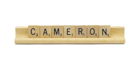 Miami, FL 4-18-24 popular baby boy first name of CAMERON made with square wooden tile English alphabet letters with natural color and grain on a wood rack holder isolated on white background