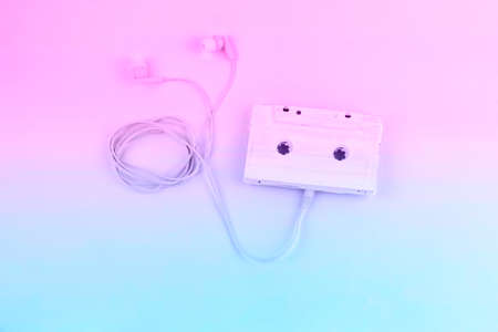 top view audio cassete tape and earphones pastel blue and pink gradient toned flat lay