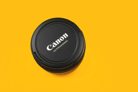 Kharkov, Ukraine - March 7, 2021: Canon lens cup close-up on yellow background