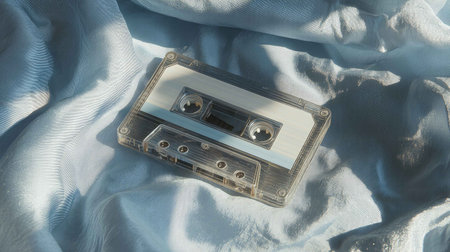 A vintage clear cassette tape rests elegantly on soft blue silk fabric, evoking nostalgia and showcasing retro audio technology. Perfect for artistic or musical themes.