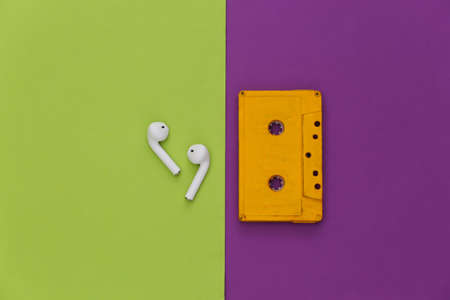 Retro audio cassette and wireless earphones on a purple-green background. top view