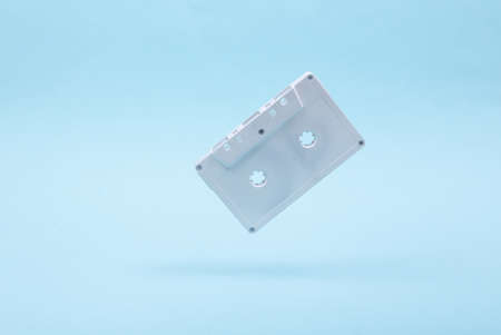 Levitating white audio cassette on blue background. 3D photo. Minimalistic still life. creative layout. concept art