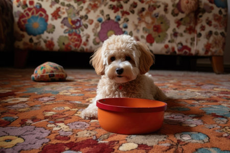 soft toy dog beside a pet bowl on a patterned carpet, created with generative ai