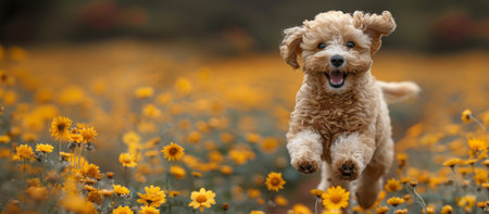 Funny puppy red poodle dog runs across the field yellow flowers close up, wide banner, copy space