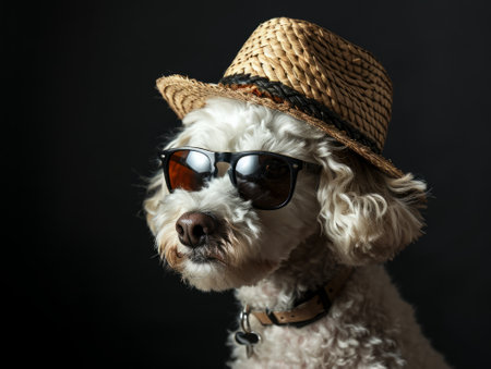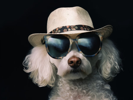 Cute poodle dog wearing a hat and sunglasses on black background