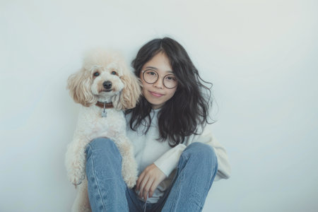 Young Asian woman wearing glasses and jeans is sitting on the floor holding her Poodle dog in front of a white background.
