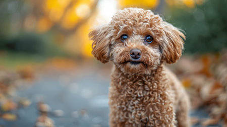 A small brown poodle stands in an autumn park, looking attentively at the camera. The scene captures the essence of pet curiosity and the beauty of fall.