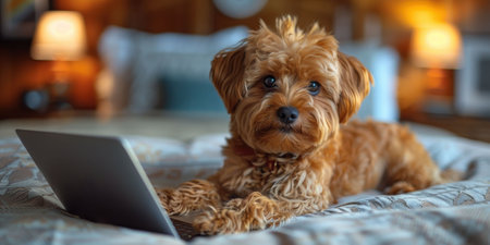 A cute dog wearing glasses, sitting with a laptop on a cozy yellow blanket, creating a cozy work-from-home vibe. High quality photo