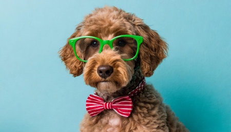 Cocker Spaniel in green glasses and bow tie on blue background
