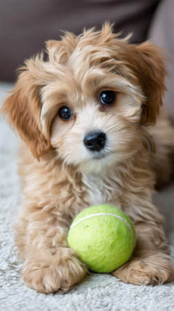 Adorable cavapoo puppy lying on a carpet with a bright green tennis ball