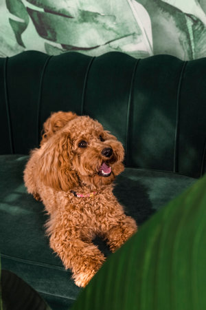 Adorable young brown poodle dog with the happy face, sitting on a green couch. indoors. Close-up.