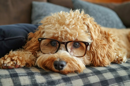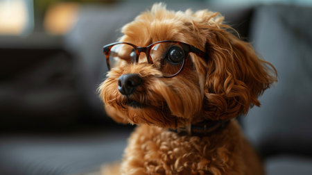 Intelligent and wellgroomed smart poodle wearing cute brown glasses. Looking attentively at the camera. In a scholarly and studious fashion. With its fluffy curly fur in a closeup portrait outdoors