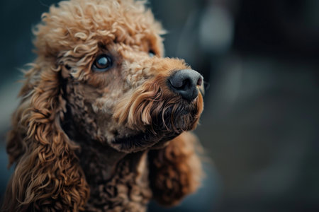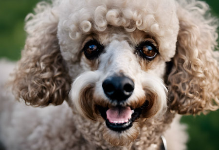 Close-up of a standard poodles face with a playful expression, set against a blurred background, A standard poodle sitting attentively with a playful expression