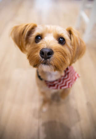 A close-up of a small dog, a york, yorkshire terrier looking at the camera in a house, in a bright room, hall. Sweet pet with a scarf, focus on a head, photo with blurred background.