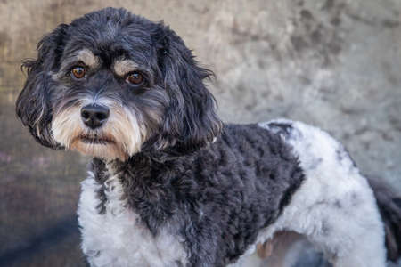 Close up portrait of a cute black and white 4 months old Havanese puppy. Selective focus on the nose.