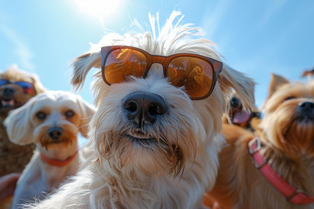 Trendy dog wearing sunglasses with a group of furry friends in the background