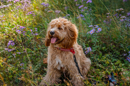Cute close up of Curly brown goldendoodle dog or Cavapoo breed in a meadow with purple flowers in summer