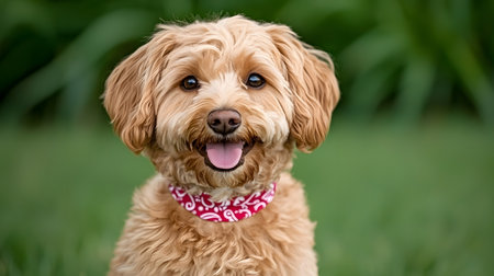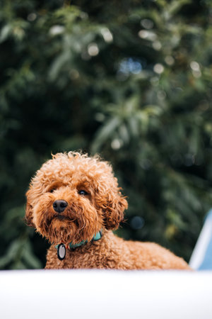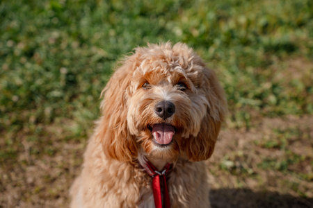 A close portrait of a charming curly brown dog outdoors. The dog is a cross between a poodle.