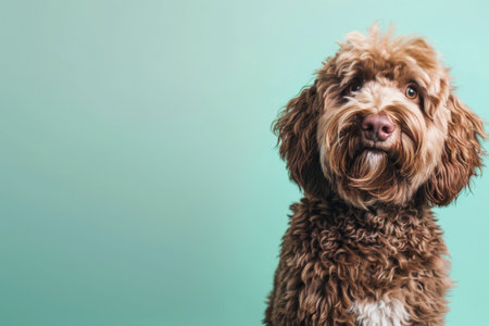 Portuguese Water Dog, angry dog baring its teeth, studio lighting pastel background