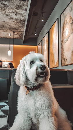 Cute white dog sitting in cafe and looking at the camera.