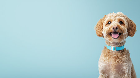 Cute dog with blue collar on a blue background. Copy space.