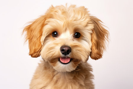 Maltipoo dog with kind eyes and brown fur posing over white background looking healthy and happy