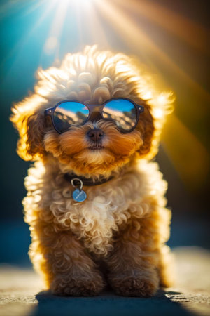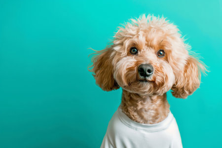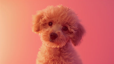 A photorealistic illustration features an adorable poodle wearing a colorful ribbon