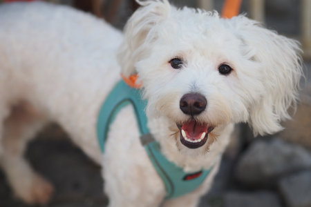 Happy white dog with blue harness enjoying the outdoors